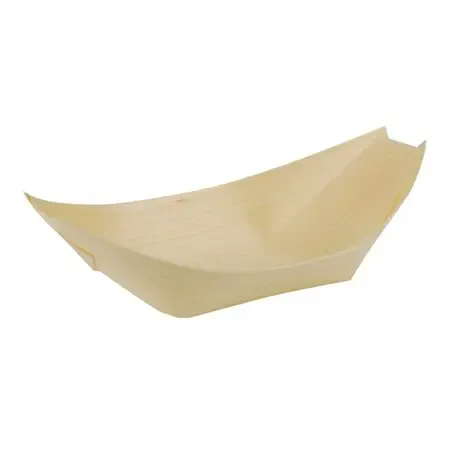 Deze milieuvriendelijke schaaltjes, gemaakt van hoogwaardig, biologisch afbreekbaar hout, zijn perfect voor het presenteren van snacks en gebakjes. Het unieke "Bootje" ontwerp voegt een charmante touch toe aan elke tafelpresentatie. Licht van gewicht en stapelbaar, ze zijn gemakkelijk te hanteren en te vervoeren. Ideaal voor cateraars, restaurants en hotels. Let op: niet geschikt voor vloeibare producten. Maat: 140 x 82mm.