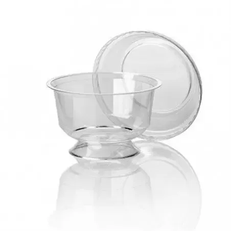 Dessert Cups on Foot PP Transparent Ø 95mm - These transparent dessert cups are perfect for serving desserts, ice cream, fruit, or other treats at parties and events. Made of sturdy PP material, they are durable and easy to clean. Ideal for catering, restaurants, or home use, these cups are suitable for both cold and hot dishes and can be safely used in the fridge and freezer. The foot design ensures stability and prevents spills, while the transparent color allows for a beautiful presentation of the contents. Perfect for any occasion! For these cups, a high dome lid and a flat lid are available. The lids are sold separately and can be found at the bottom of the page.