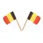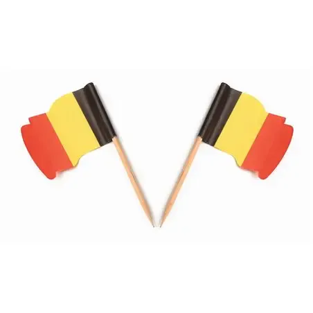 Flag Picks "Belgium" Fluttering - Perfect for serving appetizers and snacks at Belgian-themed parties or during Belgian team sports events, these 7cm Flag Picks feature the Belgian flag fluttering in the wind. Made of sturdy material and disposable, they make cleanup a breeze. Ideal for presenting cheese cubes, sausages, and olives, these fun and festive picks add extra atmosphere and coziness to your appetizers. Elevate your food presentation with these charming Flag Picks and impress your guests with a touch of Belgian flair.