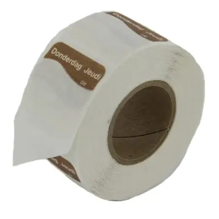 Rotation Labels - Day Stickers (Thursday off) Brown Ø 25mm - These brown Day Stickers are essential for professional kitchens, designed to show replacement dates clearly, ensuring food safety and reducing waste. HACCP-compliant, washable, and reusable for sustainability. Easy to apply and remove, fitting into dispensers for efficient production. The brown color aids recognition, while the 25mm diameter offers visibility without taking up space. Keep your workspace safe and organized with these indispensable labels, perfect for any professional kitchen or workspace involved in food preparation and storage.