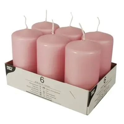 Old pink stump candles with a diameter of 6 cm and a height of 11.5 cm. These candles are guaranteed to be of high quality and have a burning time of approximately 24 hours.