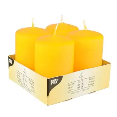 Yellow Pillar Candles Ø 50 x 80mm - These candles have a diameter of 5cm and a height of 8cm, offering approximately 16 hours of burn time. Sold in a pack of 4, they are perfect for creating a cozy atmosphere. The bright yellow color adds a cheerful touch, ideal for romantic dinners or everyday use. Enjoy their long-lasting burn time and even flame, designed for safety and style. Add warmth and ambiance to any occasion with these high-quality candles from Papstar.