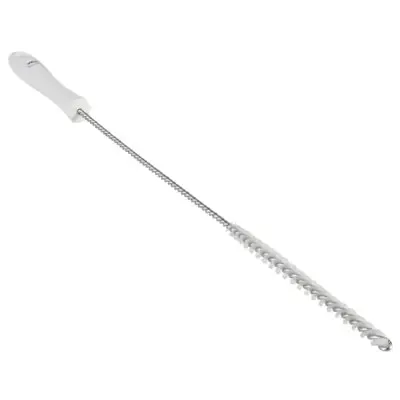 The Vikan Hard Pipe Brush With Handle in white is a powerful cleaning tool for pipes and tubing. It features a sturdy handle for easy operation and is equipped with hard polyester fibers with a diameter of ø10mm, making it ideal for thorough cleaning.