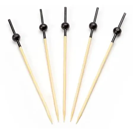 These elegant bamboo picks of 100mm are perfect for serving small bites and snacks. The black ball on top adds a stylish accent to your presentation, ideal for parties and events.