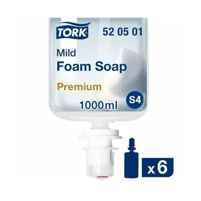 Tork Mild Foam Soap Transparent Perfumed 1 Liter - System S4 - The Tork Premium foam soap is essential for organizations focusing on hygiene and care. This gentle yet effective foam soap leaves hands feeling soft and fresh, with a pleasant scent and moisturizing ingredients. Suitable for all skin types, it prevents dryness even with frequent use. Designed for the Tork S4 foam soap dispenser, this soap comes in a recyclable 1-liter bottle that collapses as it's used, reducing waste. Maintain high hygiene standards while providing a pleasant handwashing experience for employees and customers with Tork Premium foam soap.