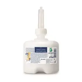 Tork Mild Mini Liquid Soap Light Yellow Perfumed 475ml per Bottle - System S2 - This high-quality hand soap is designed for Tork S2 dispensers, offering an all-in-one solution that cleanses and nourishes the skin with moisturizing ingredients. Its fresh scent and light yellow color provide a pleasant experience for all skin types. Environmentally friendly with EU Ecolabel certification, the bottle is designed to reduce waste. The convenient 475ml size and easy replacement in Tork S2 dispensers make it a practical choice for businesses valuing quality, hygiene, and sustainability.