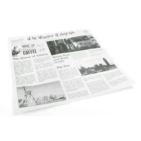 Kies voor duurzaamheid en stijl met ons Vetdicht Papier News Paper 300 x 300mm en presenteer je afhaalmaaltijden op een originele en milieuvriendelijke manier.
