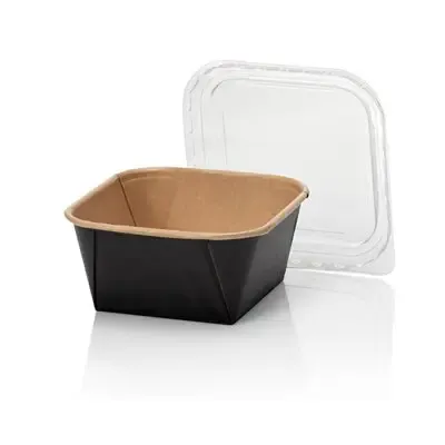 Deze vierkante bakjes van kraftkarton zijn ideaal voor het serveren van diverse gerechten. Ze hebben een natuurlijke bruine binnenkant en een strakke zwarte buitenkant. De bakjes zijn vochtbestendig dankzij een PE-coating, waardoor ze ook geschikt zijn voor vochtige gerechten. Ze zijn stapelbaar, wat handig is voor opslag en transport. Optioneel zijn er bijpassende transparante PP deksels beschikbaar, waardoor de bakjes veilig vervoerd en bewaard kunnen worden. Deze bakjes zijn een stijlvolle en duurzame keuze voor jouw bedrijf.