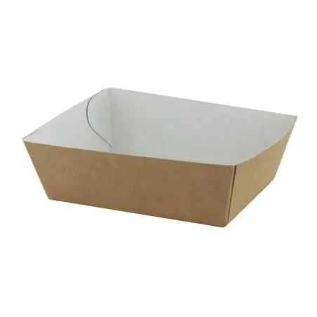 Dit compacte snackbakje A5 is gemaakt van stevig bruin karton en heeft een hygiënische witte binnenzijde. Dankzij het kleine formaat van 105 x 33 x 30mm is dit bakje perfect voor het serveren van kleine porties friet, bittergarnituur, borrelhapjes of andere snacks. Het karton is vetbestendig en recyclebaar, waardoor het bakje geschikt is voor intensief gebruik in snackbars, foodtrucks en tijdens evenementen.