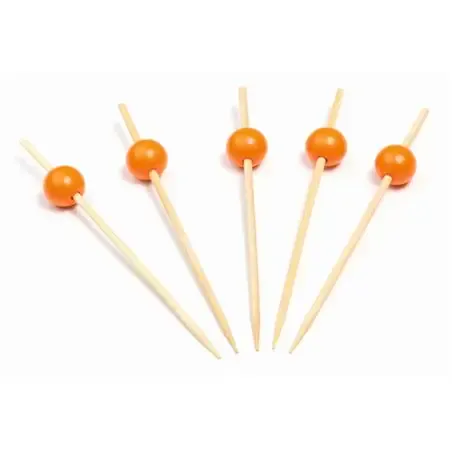 Deze bamboe prikkers zijn ideaal voor het stijlvol serveren van hapjes en gerechten. Met een lengte van 120mm en een opvallende oranje bol aan de bovenkant, voegen ze een speels accent toe aan elke presentatie.