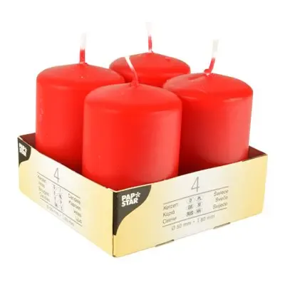 Deze rode stompkaarsen zijn gemaakt door Papstar en hebben een diameter van 5cm en een hoogte van 8cm. Deze kaarsen branden gemiddeld 16 uur en worden geleverd in een verpakking van 4 stuks. Perfect voor decoratie of als sfeerverlichting in jouw huis. Laat de warmte en de kleur van deze kaarsen jouw ruimte opvrolijken.