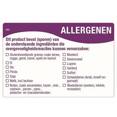Deze etiketten bevatten informatie over meerdere allergenen, zoals noten, gluten en melk. Dit is cruciaal voor klanten met voedselallergieën of -intoleranties. Door deze stickers te gebruiken, kunnen bedrijven hun klanten helpen om veilige voedselkeuzes te maken.