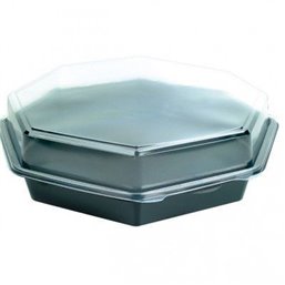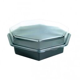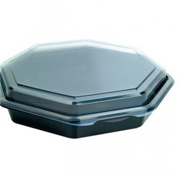 Octaview Trays PS Black + Fixed Lids Transparent - Convenient and stylish packaging solution for various dishes. Dimensions: Ø 118 x 80mm, ideal for salads, desserts, and other delicacies. Transparent fixed lids ensure secure closure and clear display of contents.