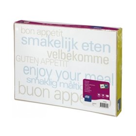 Tork Placemat Text Advanced 1-layer Decor 42x30cm - The Tork Placemat Text Advanced is a stylish and functional addition to any dining table. Protecting against dirt and stains, these hygienic placemats feature the phrase 'enjoy your meal' in different languages, sparking interesting conversations. FSC-certified and measuring 42x30cm, they are suitable for most dining tables. Lightweight and easy to handle, these placemats are perfect for casual restaurants and establishments with a specific color theme. Each box contains 5 packs of 500 placemats, making them ideal for large gatherings. Elevate your dining experience with the Tork Placemat Text Advanced.