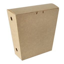 Friet Cones Karton "Pure" 1200ml 430 x 145 x 110mm Bruin Met Klapdeksel Deze bruine kartonnen Friet Cones zijn perfect voor het serveren van grote porties friet. Ze zijn gemaakt van FSC-gecertificeerd karton, wat betekent dat ze milieuvriendelijk zijn. De bakjes hebben vetwerende eigenschappen en luchtgaten om de friet knapperig te houden. Het klapdeksel maakt het gemakkelijk om de friet mee te nemen. Deze bakjes zijn ideaal voor bedrijven die op zoek zijn naar een praktische en duurzame oplossing voor het serveren van snacks.