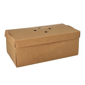 Baguette box Karton Van Verse Houtvezels "Pure" Deze baguettebox, gemaakt van verse houtvezels, is een duurzame en praktische oplossing voor het verpakken van baguettes. Met een afmeting van 10 x 13 x 25cm is het perfect voor een standaard baguette. De box is vouwbaar, wat opslagruimte bespaart en het gemakkelijk maakt om snel in elkaar te zetten. De bruine kleur geeft een natuurlijke en rustieke uitstraling. Het karton is voedselveilig en voldoet aan alle hygiënische normen. Ideaal voor bakkerijen, broodjeszaken en foodtrucks.