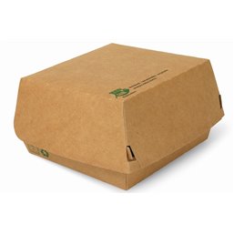 Hamburgerbakken Groot Karton "Good Food" 155 x 155 x 90mm Deze grote kartonnen hamburgerbakken zijn een duurzame en stijlvolle keuze voor het serveren van hamburgers. Ze zijn gemaakt van 100% duurzame houtvezels, volledig composteerbaar en gecertificeerd door FSC en TÜV. De bakken hebben een bruine kleur met een chique zwarte band, wat ze een unieke uitstraling geeft. Ze zijn groot genoeg voor een flinke hamburger, ideaal voor bedrijven die grote porties serveren. Deze bakken zijn niet alleen praktisch en duurzaam, maar ook stijlvol en betrouwbaar. Ze zijn een uitstekende keuze voor elk bedrijf dat zijn klanten een unieke en hoogwaardige service wil bieden.