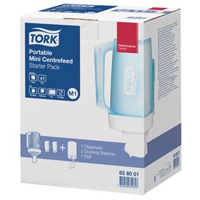Tork Draagbare Mini Centerfeed Dispenser Startpakket Wit-Turqoise Kunststof Performance-Line - Systeem M1De Tork Draagbare Mini Centerfeed Dispenser is compact, draagbaar en veelzijdig. Ideaal voor handdroging en oppervlaktereiniging in elke werkomgeving. Het startpakket bevat alles wat je nodig hebt, inclusief dispenser, docking stations en poetsrol. Gemaakt van duurzaam kunststof en gemakkelijk schoon te maken. Past in elk interieur en levert hoge prestaties. Een waardevolle toevoeging aan jouw faciliteiten voor een handige, hygiënische en efficiënte oplossing.